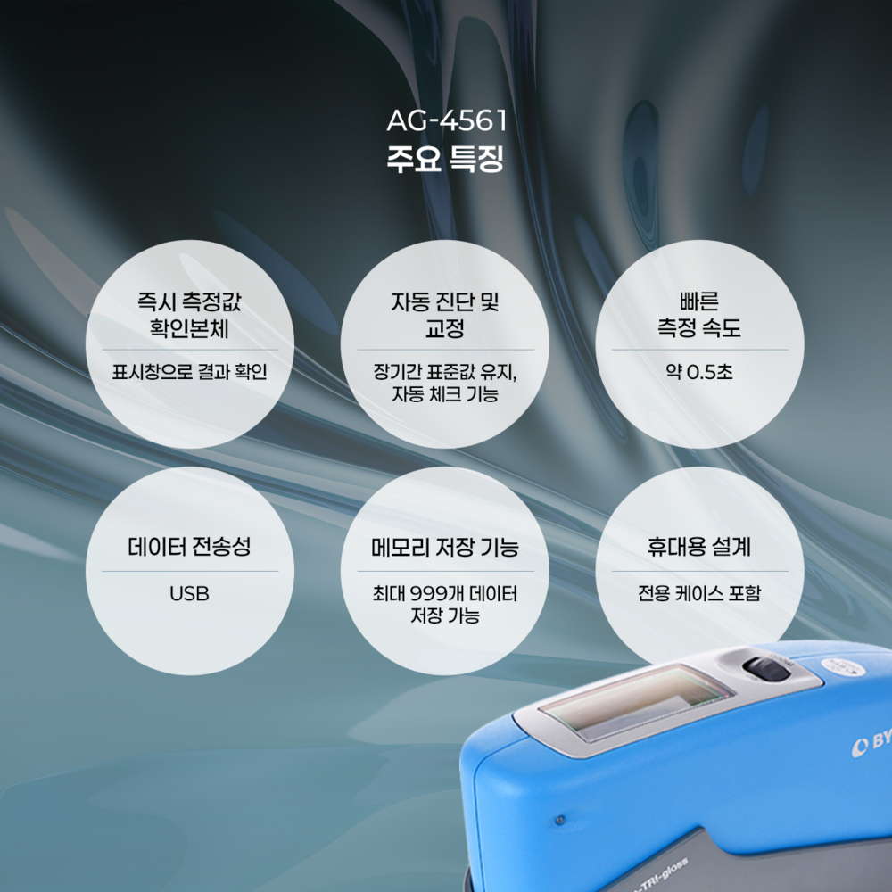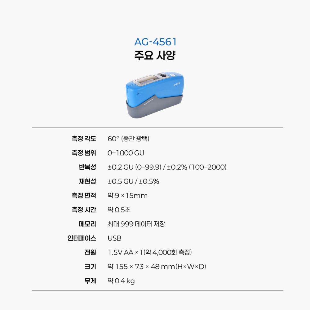 AG-4561은 독일 BYK Gardner에서 제조한 휴대용 중간 광택 측정기로, 표면의 광택(Gloss)을 60° 각도에서 측정하는 계측기입니다. 비교적 빠른 측정 속도와 USB 데이터 전송 기능을 활용해 품질 관리, 연구·개발, 도장/플라스틱 등 다양한 산업에 적합합니다.