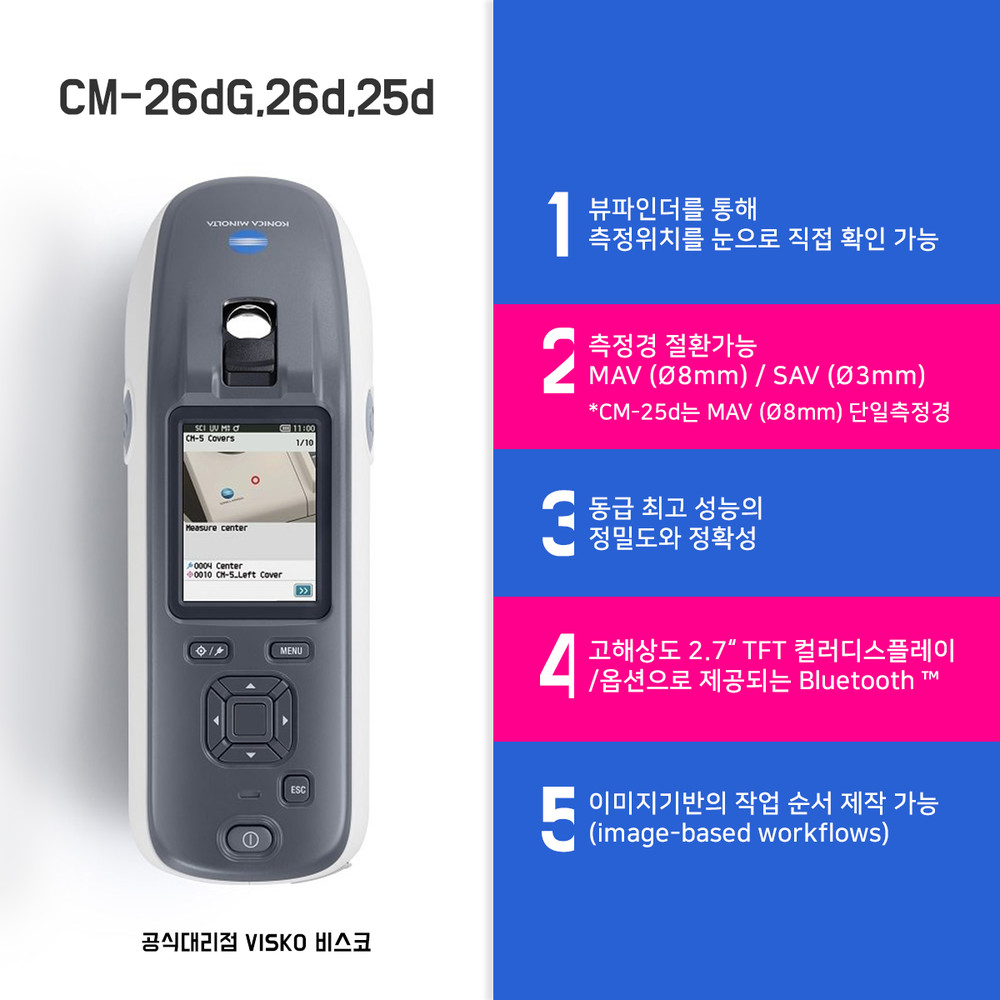 CM-26dG와CM-26d는 휴대용 분광측색계 중에서 전례없는 높은 정밀도로 정확도와 기기간오차를 최소화하였으며