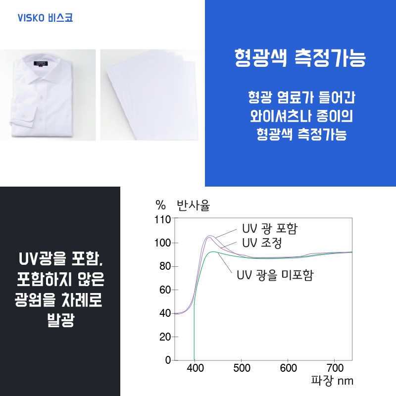 UV광을 포함한 광원으로 형광염료가 들어간 섬유, 용지의 반사율 측정 가능