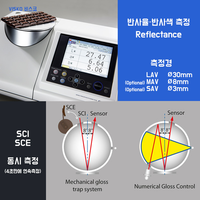 반사 측정은 다른 분광측색계와 마찬가지로 SCI / SCE 모드를 선택할 수 있습니다.