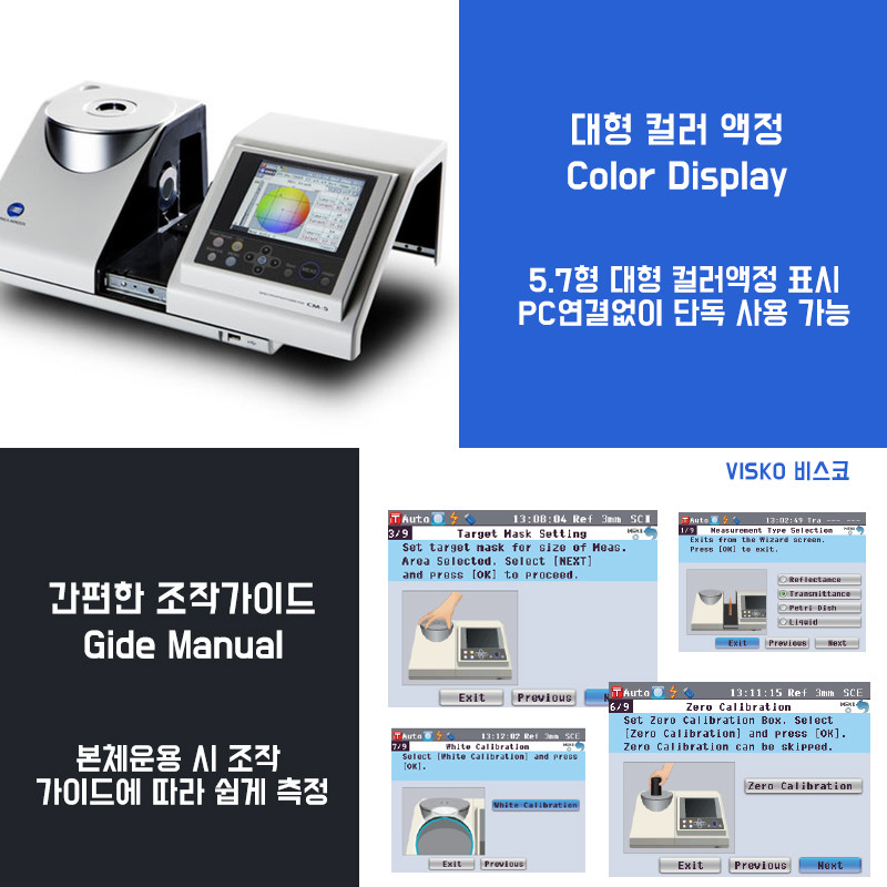 투과측정이 가능한 분광측색계 중에서 유일하게 LCD가 탑재되어 있기 때문에 본체 단독으로 운용이 가능하며