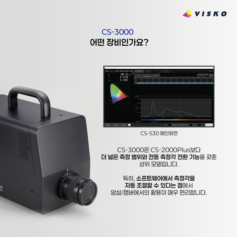 CS-3000은 CS-2000Plus보다 더 넓은 측정 범위와 전동 측정각 전환 기능을 갖춘 상위 모델입니다.