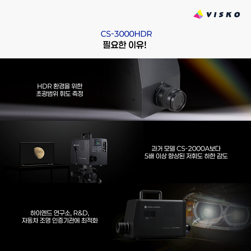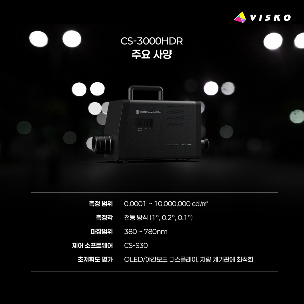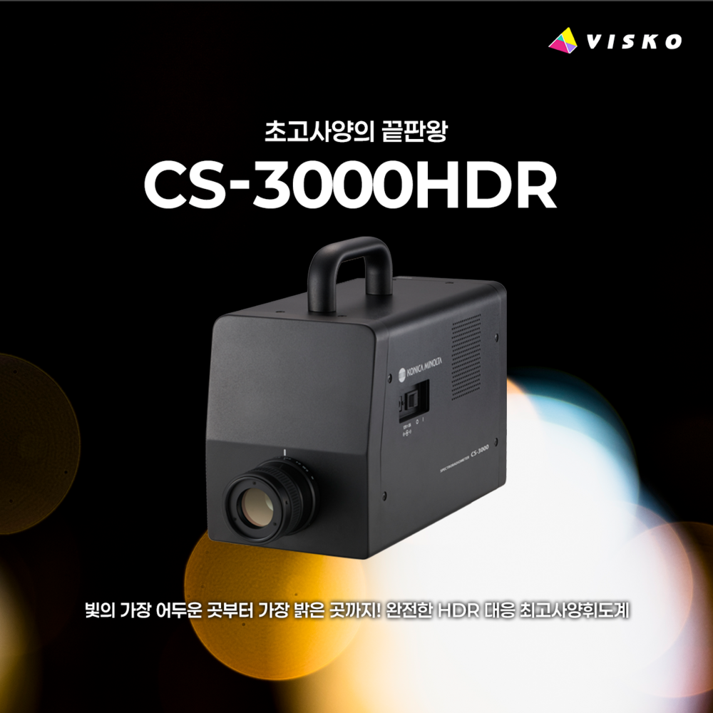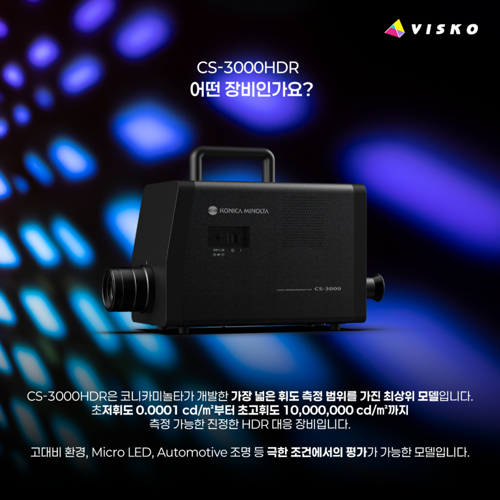 CS-3000HDR은 코니카미놀타가 개발한 가장 넓은 휘도 측정 범위를 가진 최상위 모델입니다. 초저휘도 0.0001 cd/㎡부터 초고휘도 10,000,000 cd/㎡까지 측정 가능한 진정한 HDR 대응 장비입니다. 고대비 환경, Micro LED, Automotive 조명 등 극한 조건에서의 평가가 가능한 모델입니다.
