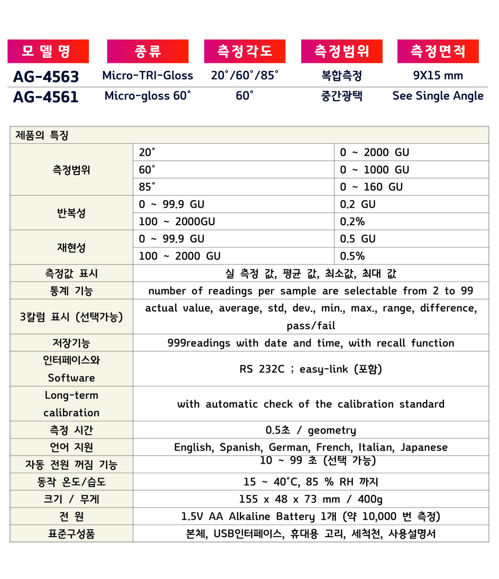 20°, 60°, 85° (고광택, 중간광택, 저광택) 3개의 측정 데이터 출력 가능