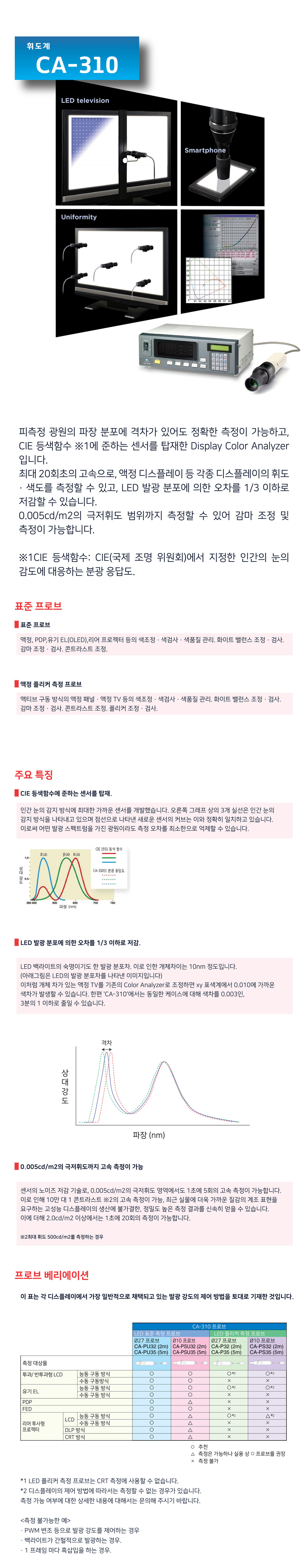 현재는 OLED 및 HDR 디스플레이의 초저휘도, 색도 등을 측정가능한 CA-410 모델까지 출시 되었습니다.