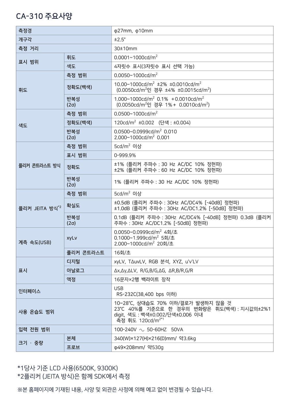 OLED 및 HDR 디스플레이의 초저휘도, 색도 등을 측정가능한 CA-410 모델까지 출시 되었습니다.