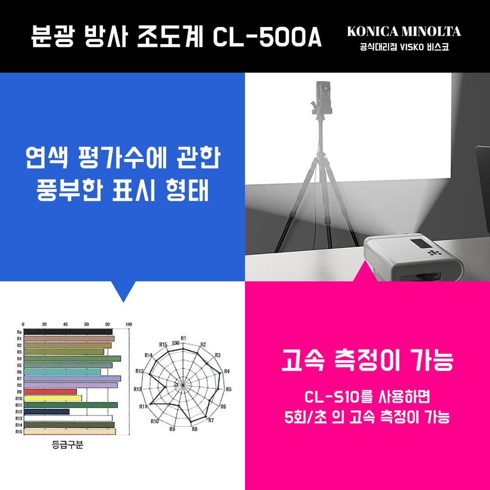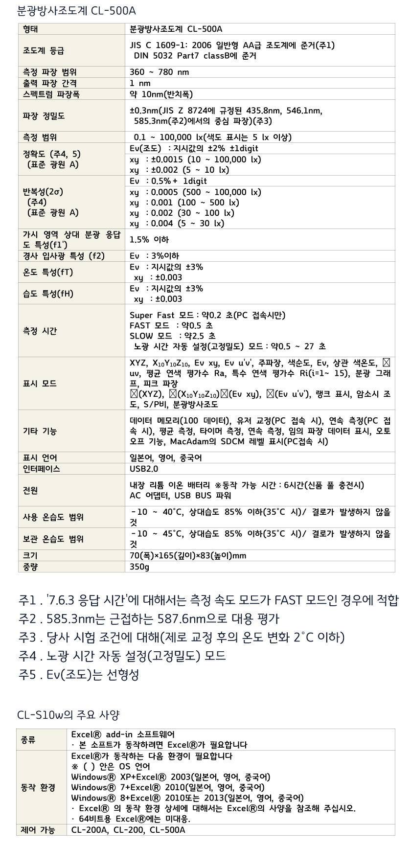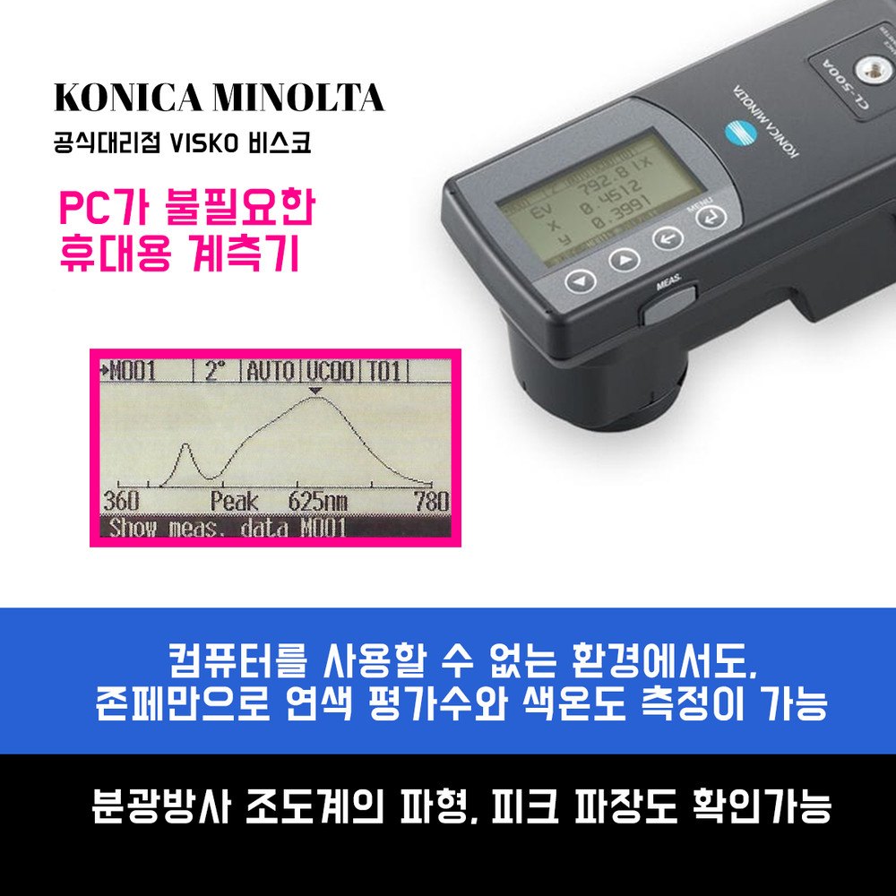 분광방사조도계 CL-500A는 광원의 연색 평가수, 상관 색온도, 색도, 조도(JIS일반형 AA급), 암소시 조도, 삼자극치,