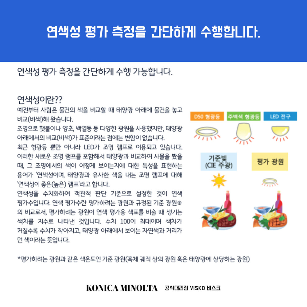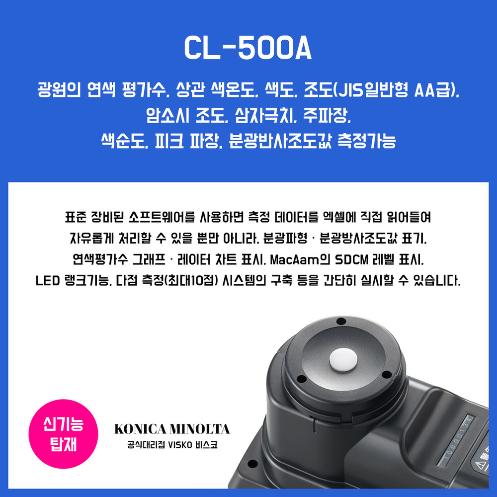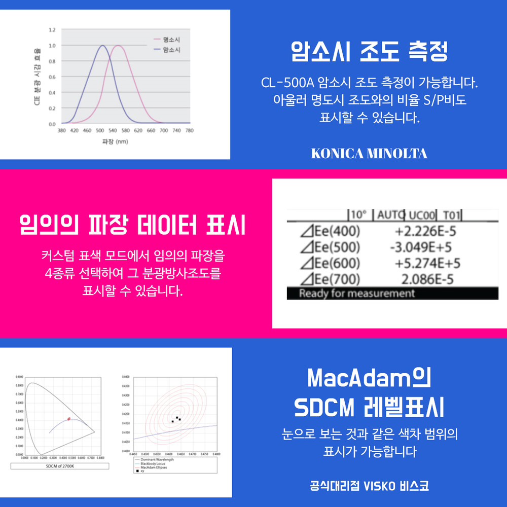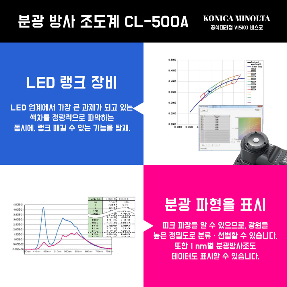분광방사조도계 CL-500A는 광원의 연색 평가수, 상관 색온도, 색도, 조도(JIS일반형 AA급), 암소시 조도, 삼자극치,