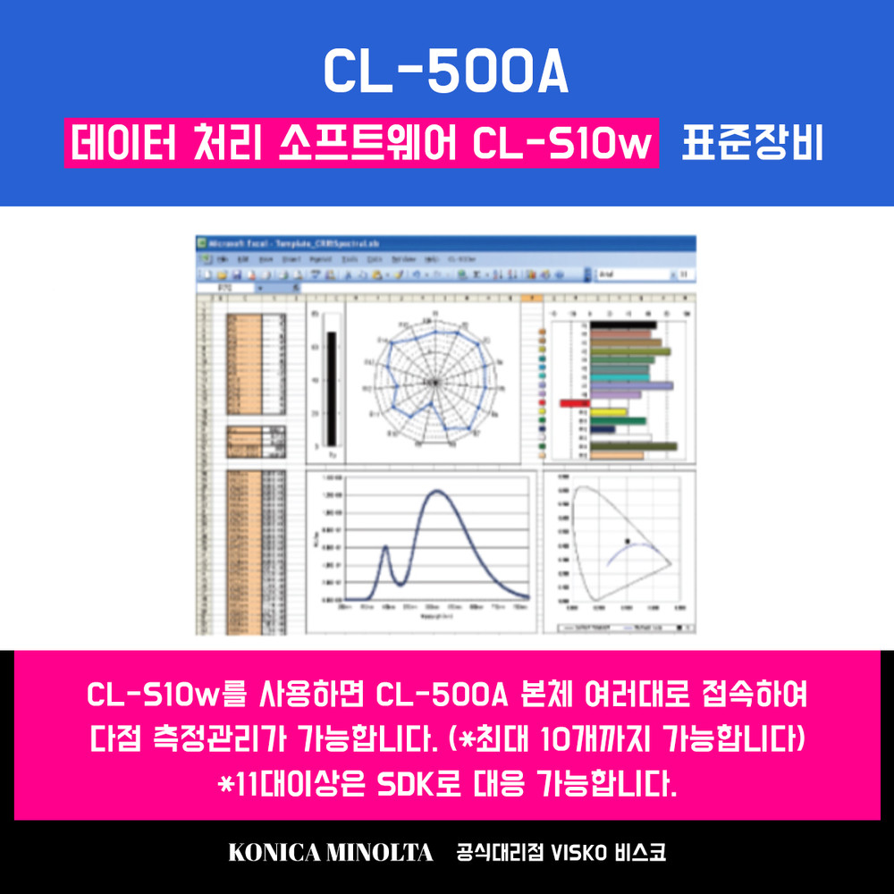 표준장비된 소프트웨어를 사용하면 측정 데이터를 엑셀에 직업 읽어들여 자유롭게 처리할 수 있을뿐만 아니라, 분광파형 · 분광방사 조도값 표시, 연색 평가수 그래프 데이터 · 레이더 차트 표시, Mac Adam의 SDCM레벨, LED 랭크 기능, 다점 측정(최대 10점) 시스템의 구축 등을 간단히 실시할 수 있습니다.