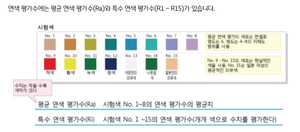 또한 평균 연색 평가수 Ra와 특수연색 평가수 Ri(i=1~15)를 한눈에 알 수 있습니다.