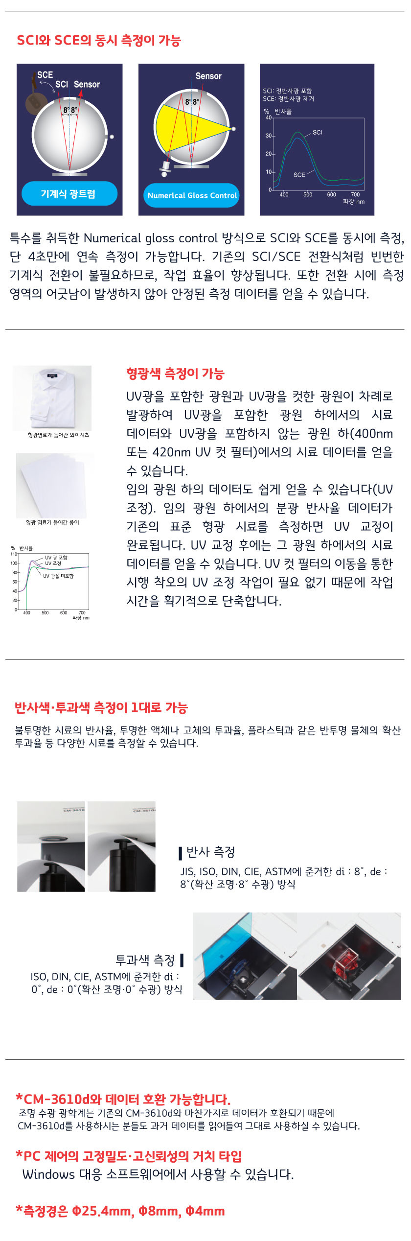 1. 각종 규격에 준거한 di:8°, de:8° (확산 조명 · 8° 수광 방식) 광학계를 채택하고 있습니다.