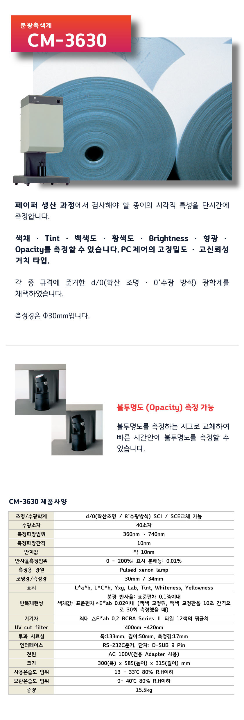CM-3630은 페이퍼 생산 과정에서 검사해야 할 종이의 시각적 특성을 단시간에 측정합니다.