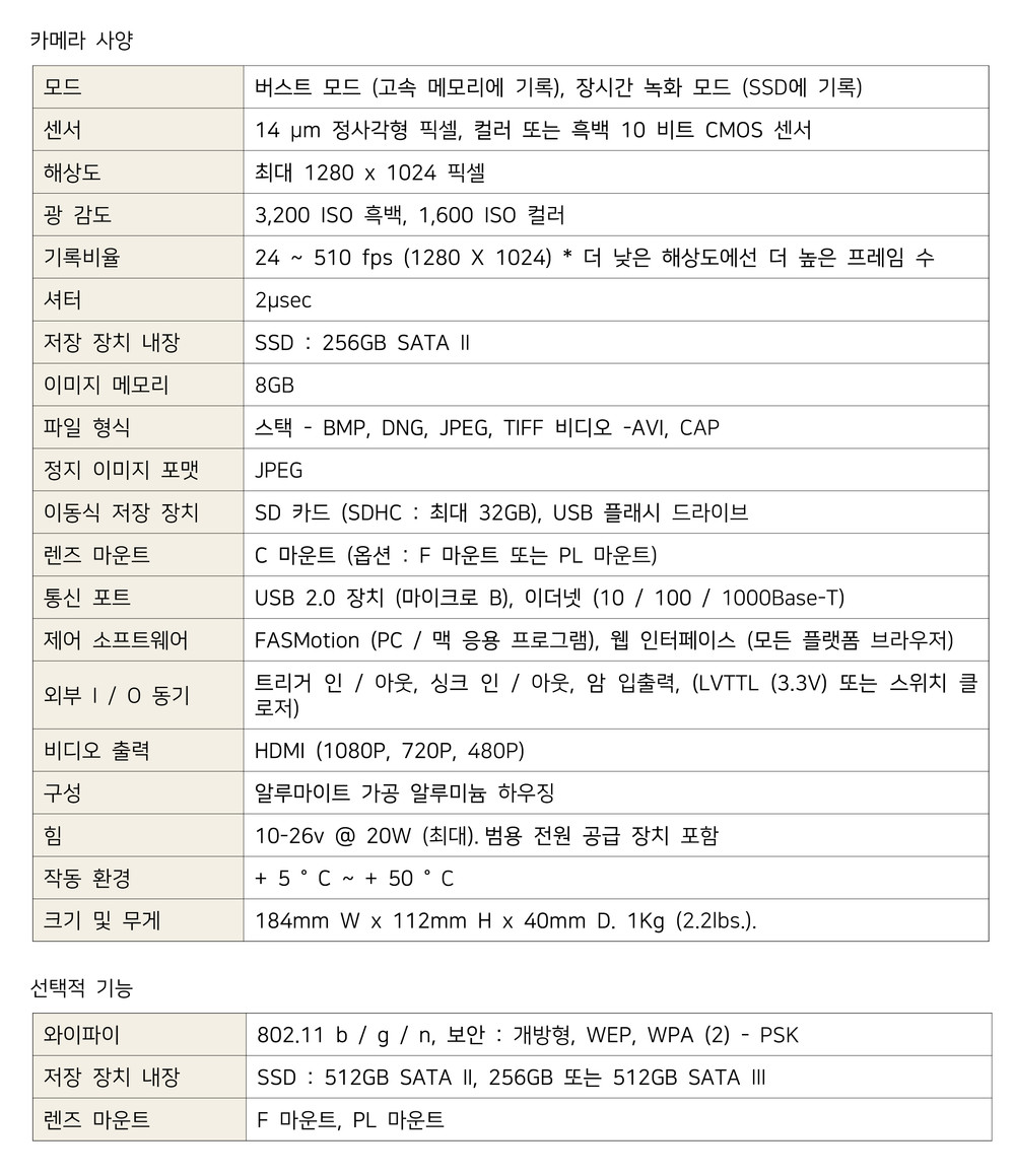 또한, VGA 해상도(640 x 480)에서 1541 fps 로 약 15분간 녹화가 가능합니다. (SATA III / SSD 512GB 옵션)