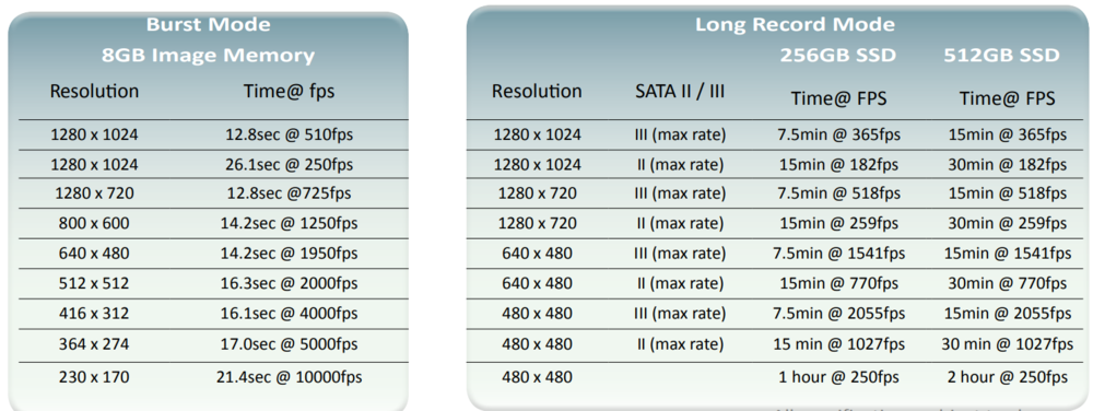 최대 해상도(1280 x 1024)에서 365fps 로 약 15분간 녹화가 가능합니다. (SATA III / SSD 512GB 옵션)