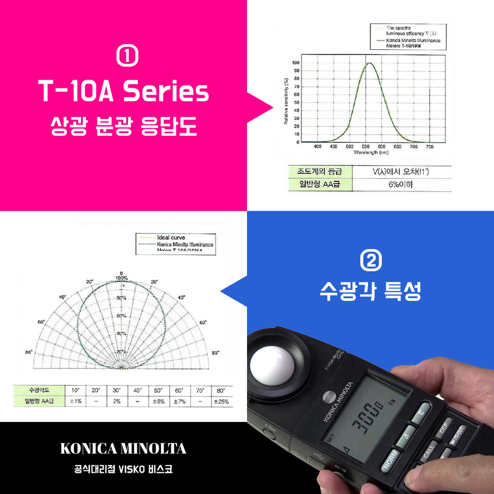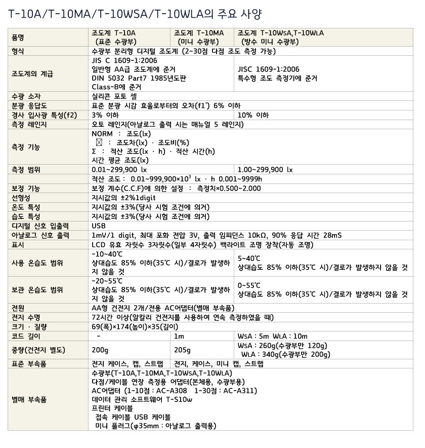 조도계 T-10A/T-10MA의 상대 분광 응답도 특성은 JIS 일반형 AA급조도계에 해당합니다.