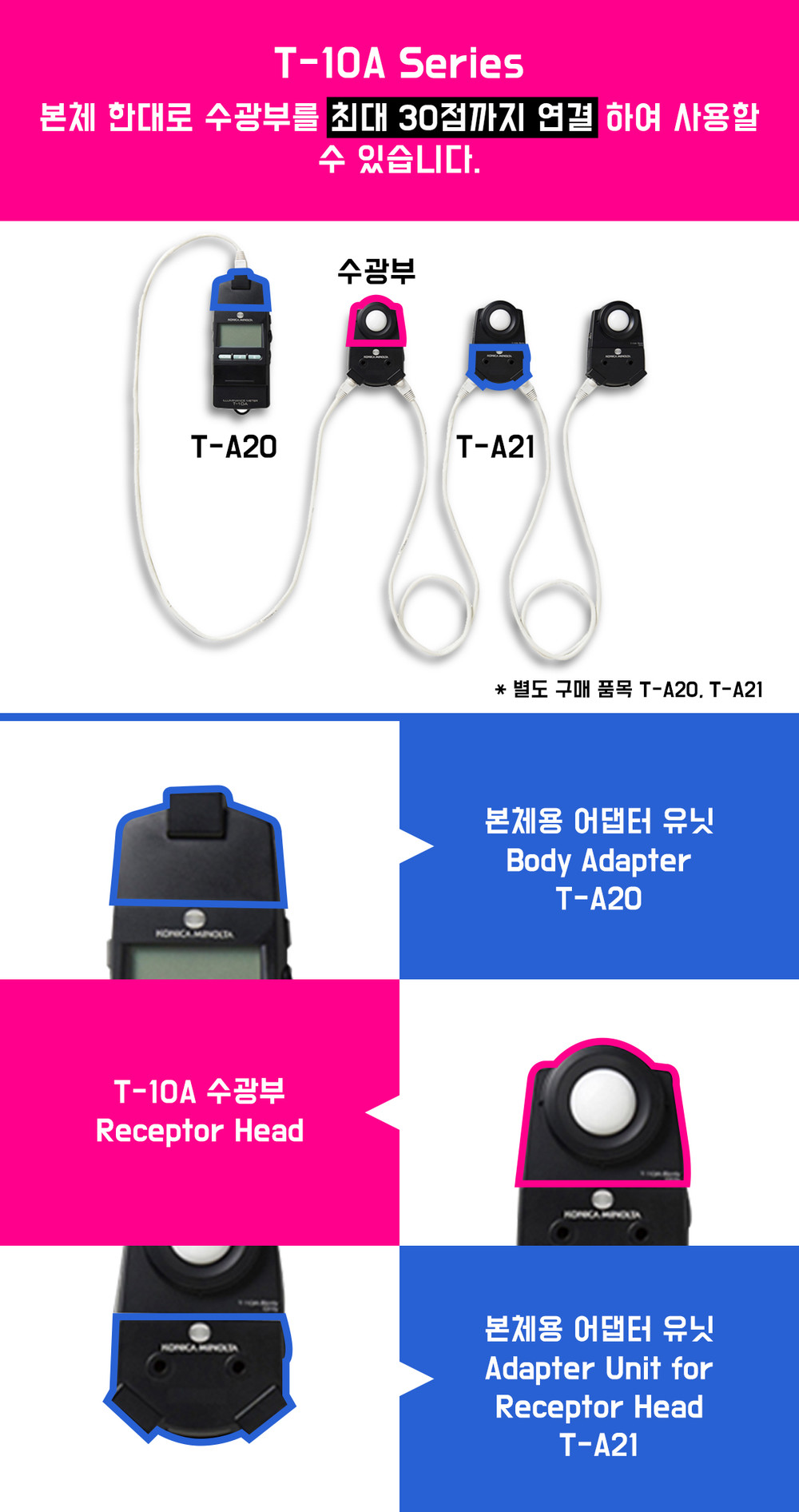 T-10A시리즈의 경우 본체 한대로 최대 30개(본체포함)의 기기를 연결하여