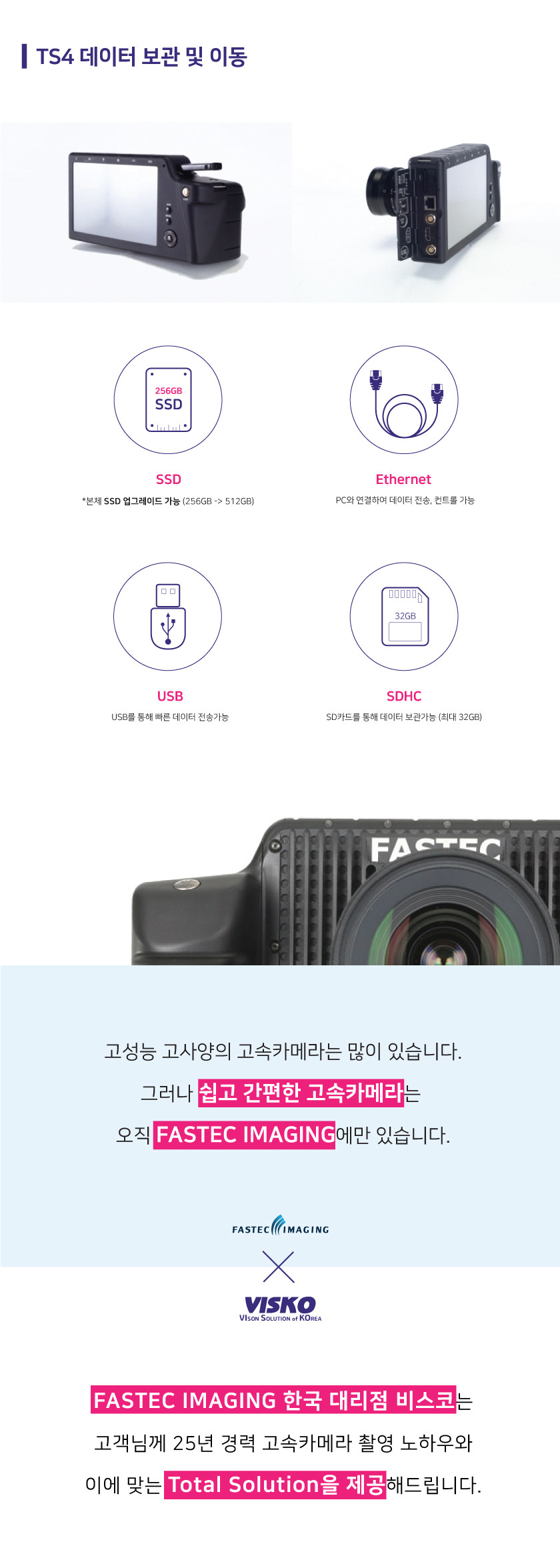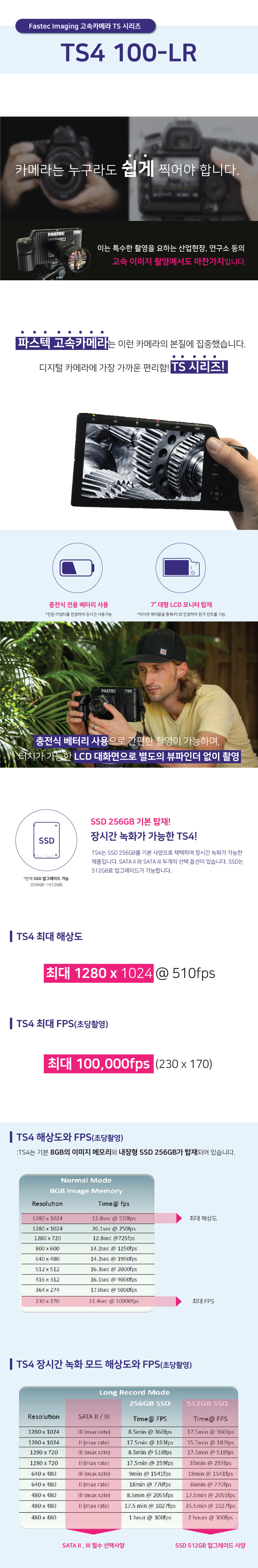 장시간 녹화모드 : SSD 256GB를 기본 사양으로 채택하고 있어 장시간 녹화가 가능한 제품입니다. SATA ll 와 SATA lll 두개의 선택 옵션이 있습니다. 몇 초만에 기록하고 신중한 트리거링을 필요로하는 기존의 고속카메라 시스템과 달리 FASTEC TS4는 수분 또는 수 시간 동안 끊임없이 고속으로 녹화 할 수 있습니다.