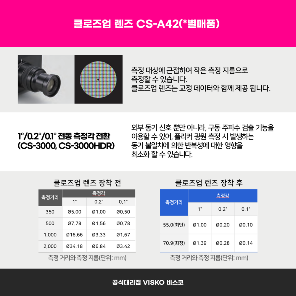 별도의 클로즈업 렌즈를 장착시 55mm의 단거리에서 소자 연구용으로 사용하거나