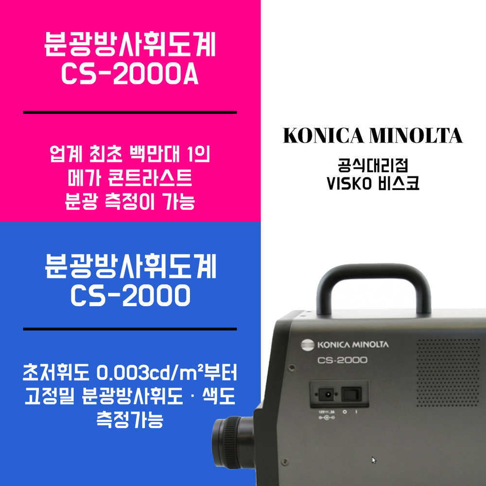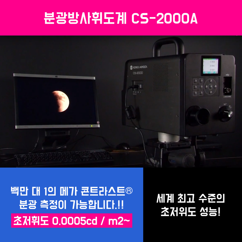 CS-2000A는 0.0005cd/m2 라는 세계 최고 수준의 초저휘도 측정성능을 지닌 백만 대 1의 메가 콘트라스트 분광 측정이 가능한 Poly-chomator 방식의 분광방사휘도계 입니다.